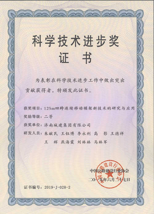 集团《125m四跨连续移动模架新技术的研究与应用》荣获“科学技术进步奖二等奖”