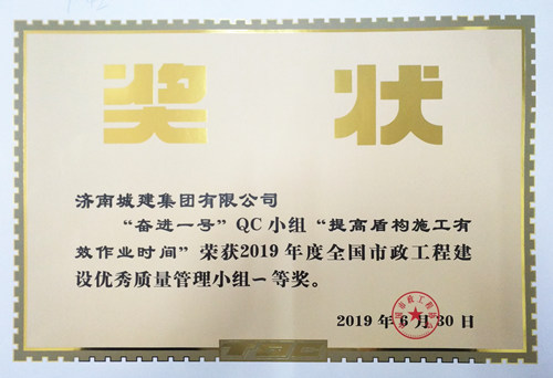 集团“奋进一号”QC小组《提高盾构施工有效作业时间》荣获“2019年度全国市政工程建设优秀质量管理小组一等奖”