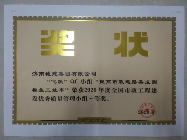 集团“飞跃”QC小组《提高市政道路集成侧模旗效率》荣获2020年度中国市政协会一等奖
