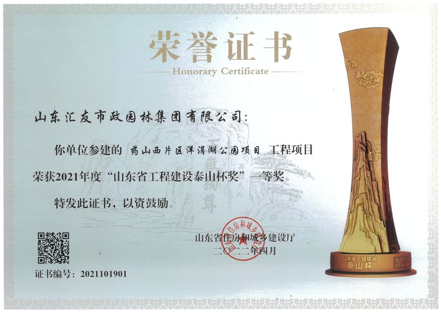 药山西片区洋涓湖公园项目工程项目荣获2021年度山东省工程建设泰山杯奖一等奖