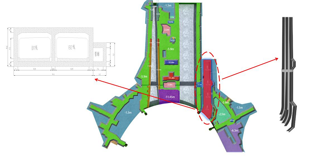 8号下穿通道位于T1航站楼西北侧,南北向横穿正在建设的济南遥墙机场T2航站楼,连接南、北工作区,可以实现工作区车辆的南北街接。8号下穿通道全长245米,采用双仓分建和双仓共建钢筋混凝土结构,双仓分建段尺寸标准段内径净宽8.25米,净高约7.2~7.5米,底板厚度1.2米,顶板厚度0.7米,中墙厚0.8米,侧墙厚1.0米。8-1通道主体涉及高支模超危大工程,墙体厚、高度宽度均渐变、圆弧线性,横穿8条斜交梁,多处异型柱,与中建三局八局预留预埋交叉施工,结构复杂,施工难度大。自项目启动以来,项目部秉持着精益求精的态度,克服困难,顺利完成8号下穿通道首段主体浇筑节点目标。